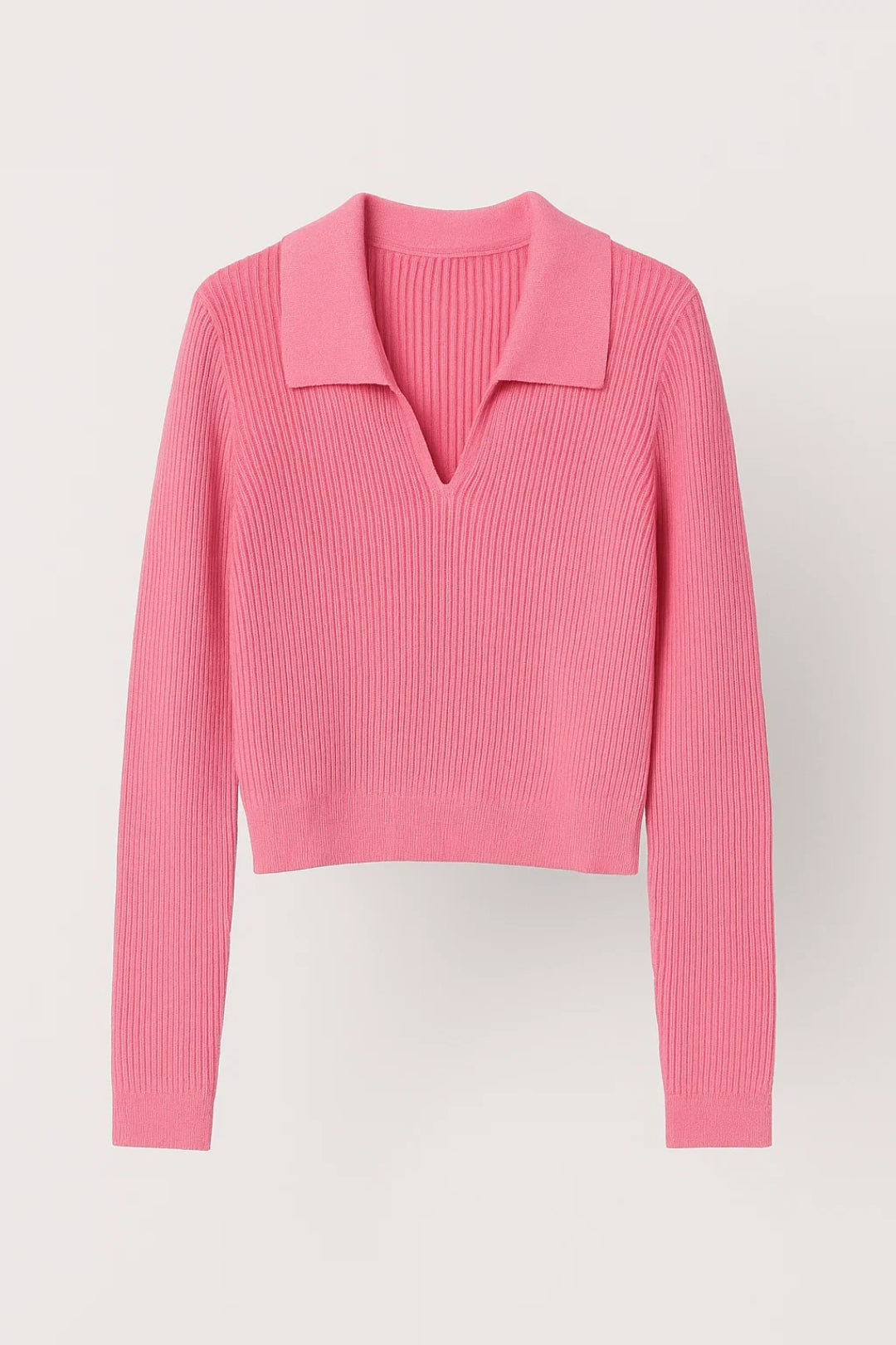 Tindral Dames Trui | Geribde Stof | V-Hals met Kraag | Roze