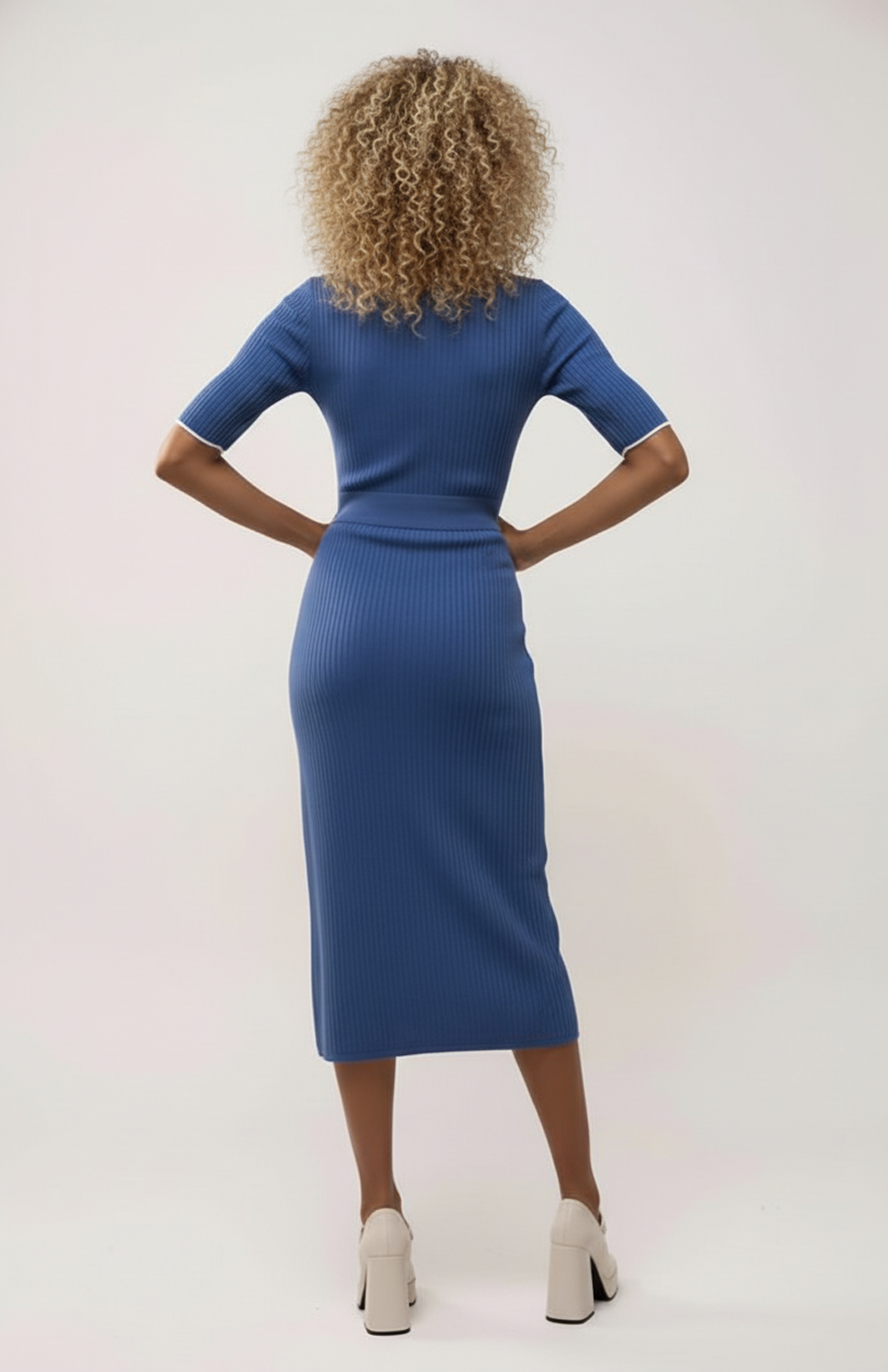 Ceciliaa Dames Midi Jurk | Geribd Knit | Polokraag | Contrasterende Afwerking