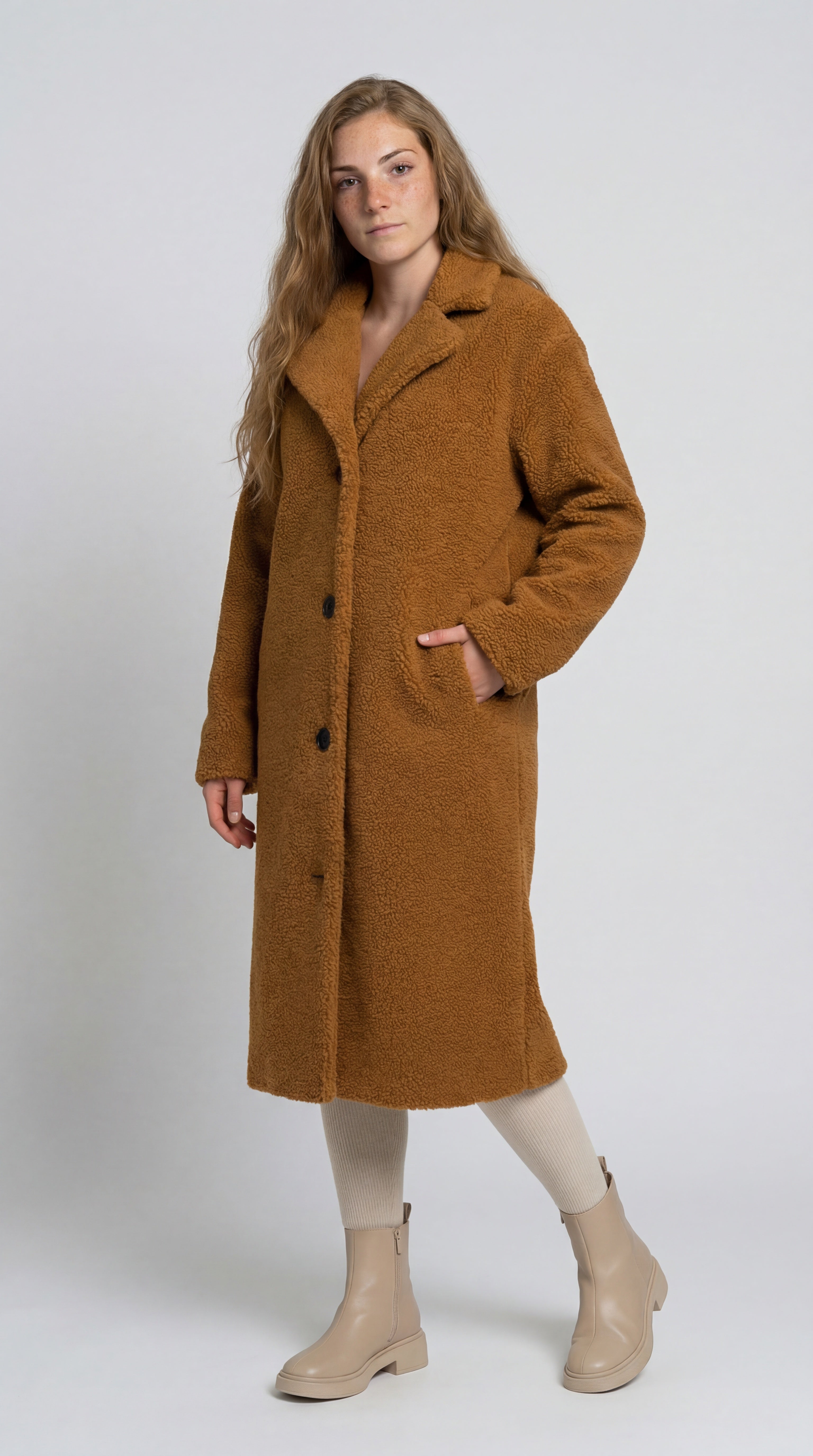 Deze dames jas heeft een moderne uitstraling met een zachte teddy structuur en een relaxed silhouet. De brede kraag en knoopsluiting zorgen voor een tijdloze uitstraling, perfect voor dagelijks gebruik in de winter.