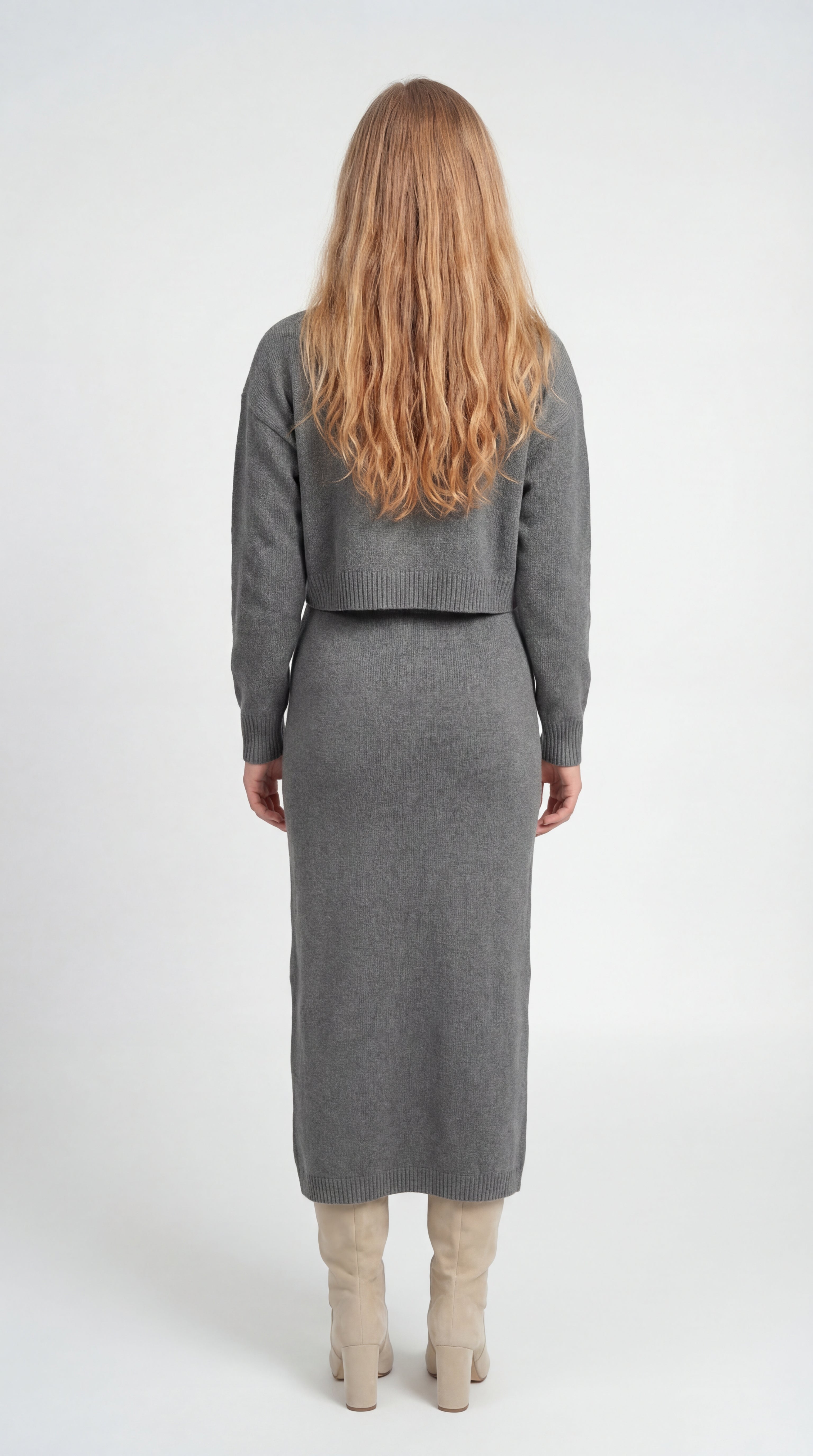 Op zoek naar een stijlvolle jurk die comfort en elegantie moeiteloos combineert? Deze gebreide midi jurk met bijpassende cropped top creëert een moderne, gelaagde look met een verfijnde uitstraling.