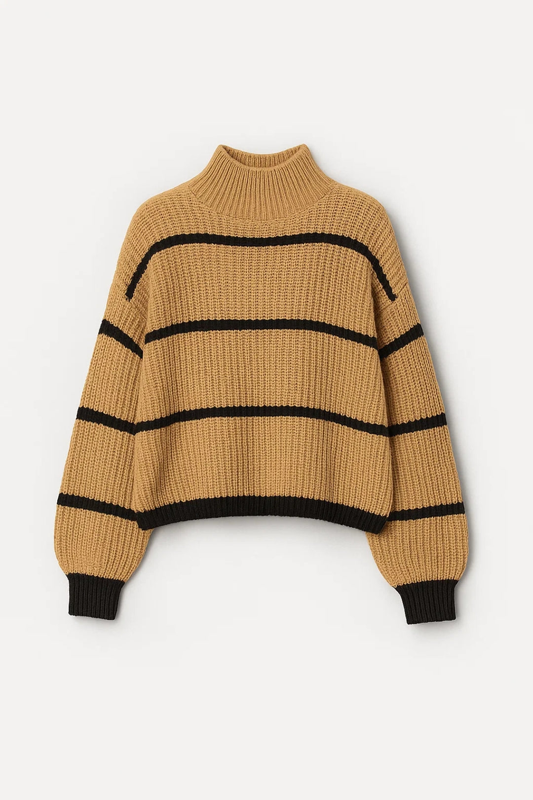 Deze gebreide damestrui met horizontale strepen biedt een moderne uitstraling en is ideaal voor frisse dagen. De opstaande kraag en geribde boorden zorgen voor een verfijnde afwerking van dit casual kledingstuk.