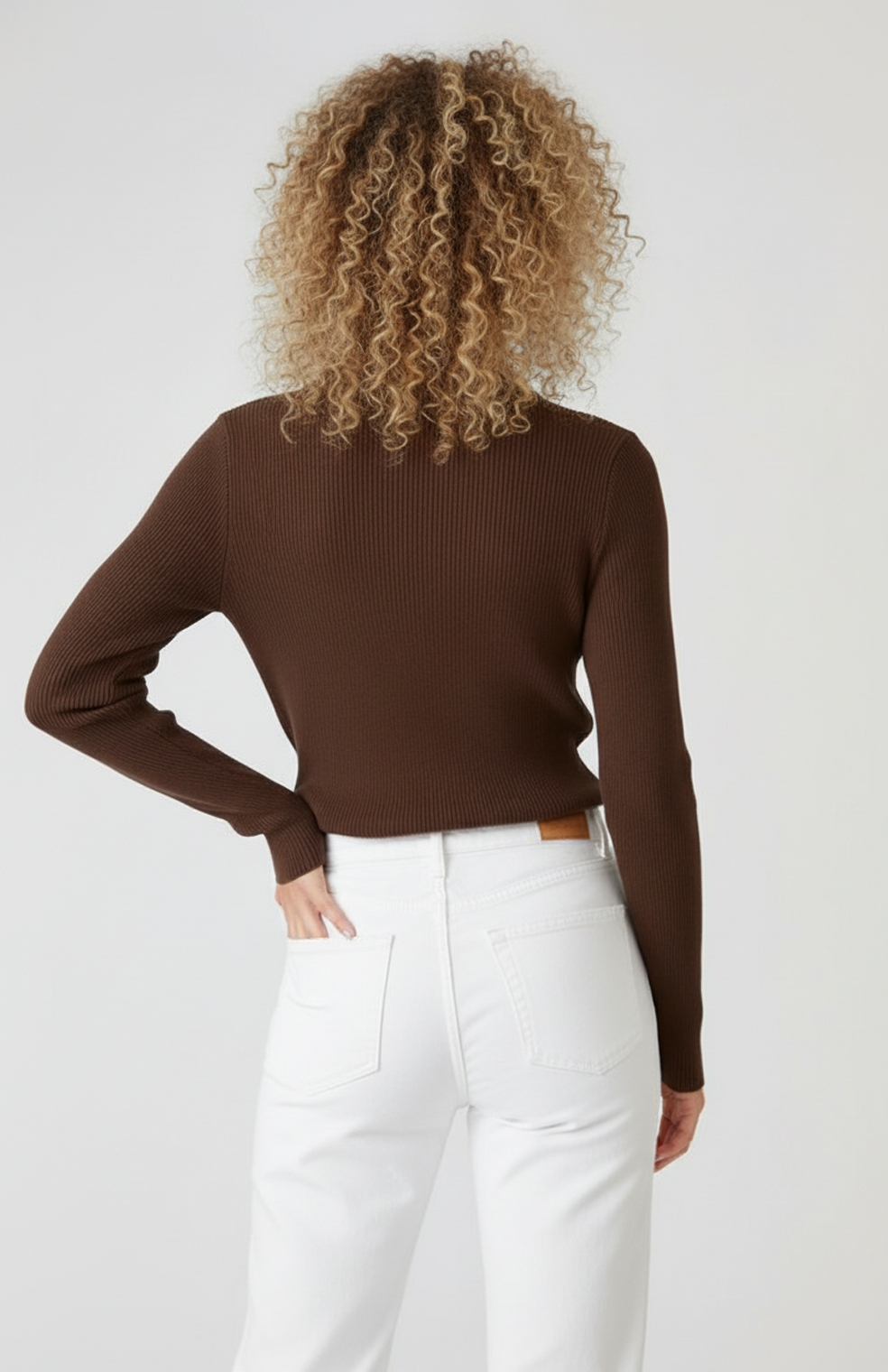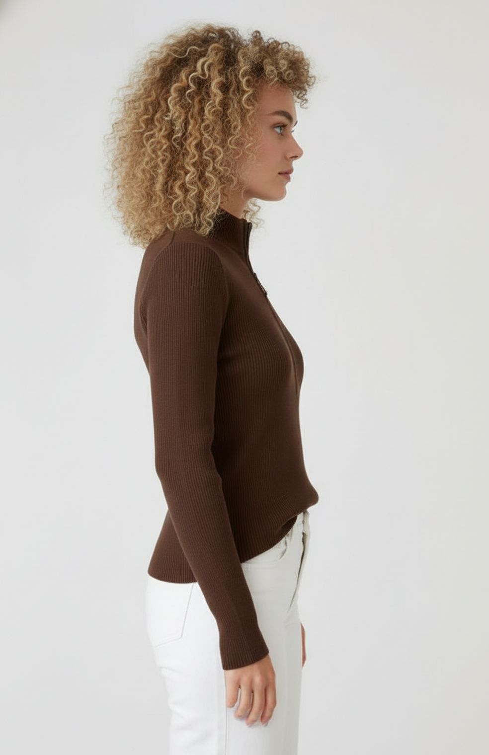 Deze geribbelde trui met een halfhoge kraag en ritssluiting biedt een comfortabele pasvorm en een warme uitstraling. De subtiele structuur voegt een verfijnd detail toe aan het ontwerp, ideaal voor frisse herfstdagen en koude winterochtenden.