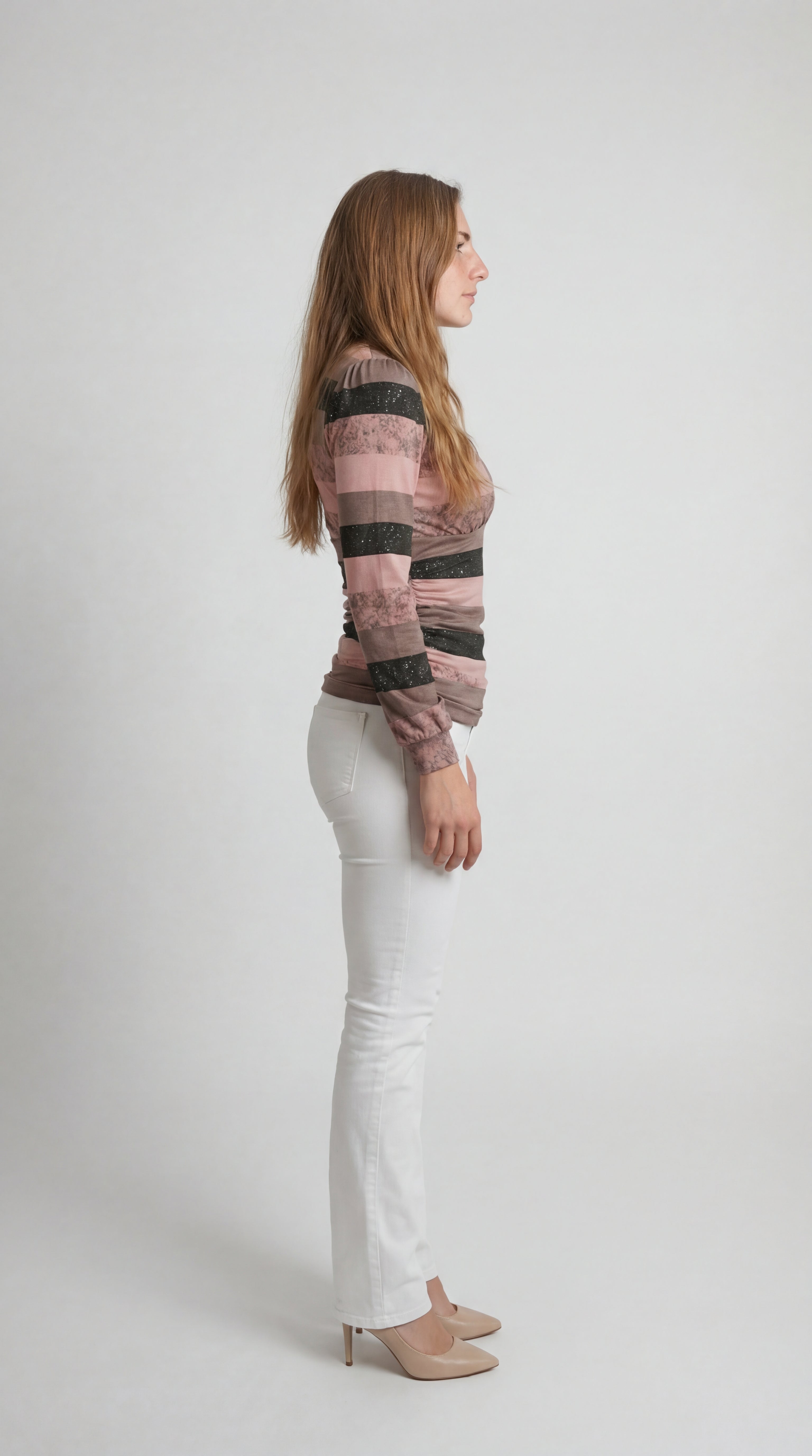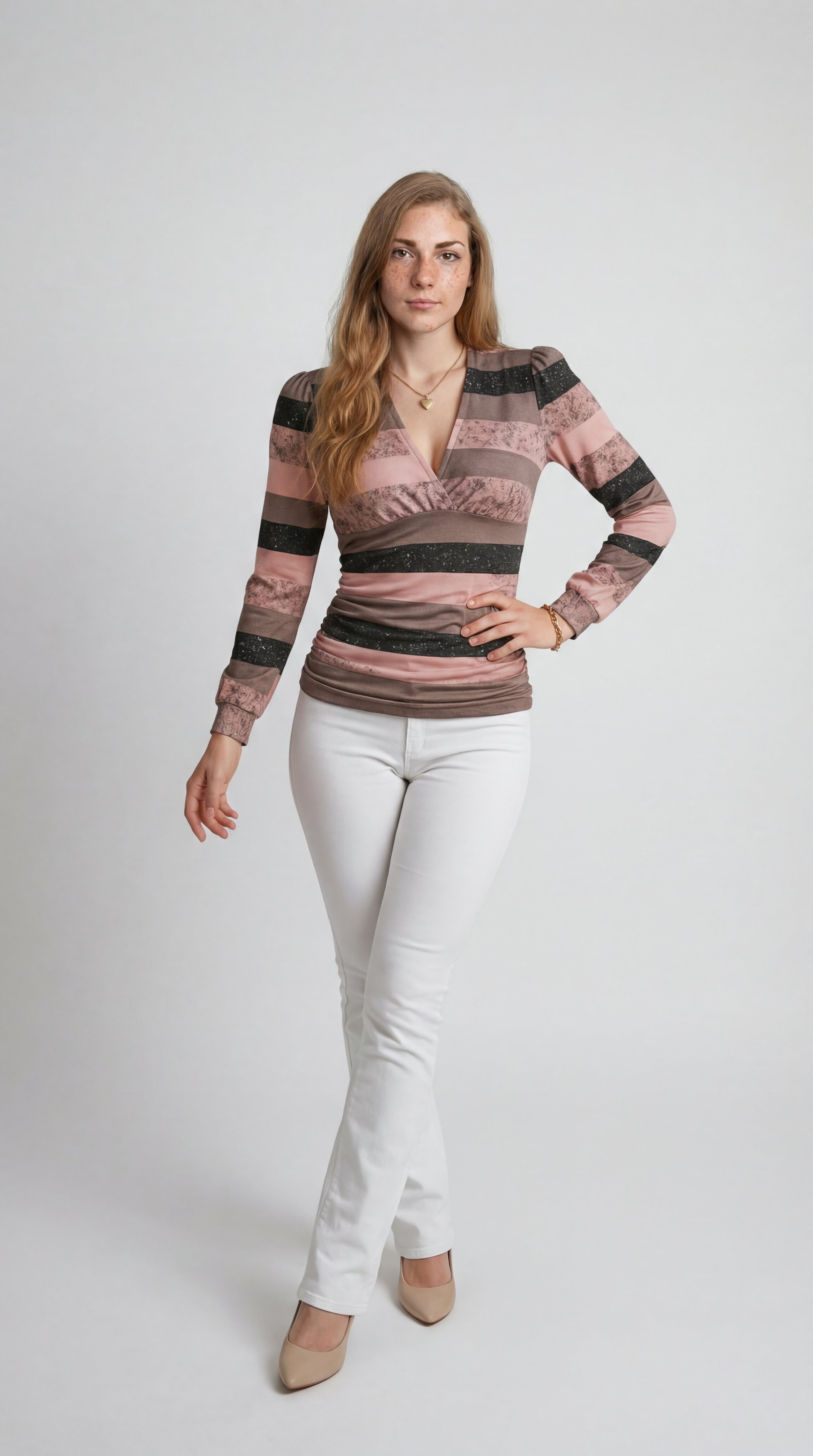 Op zoek naar een top die je figuur flatteert én opvalt? Deze elegante top combineert een vrouwelijk silhouet met een modern grafisch patroon.
