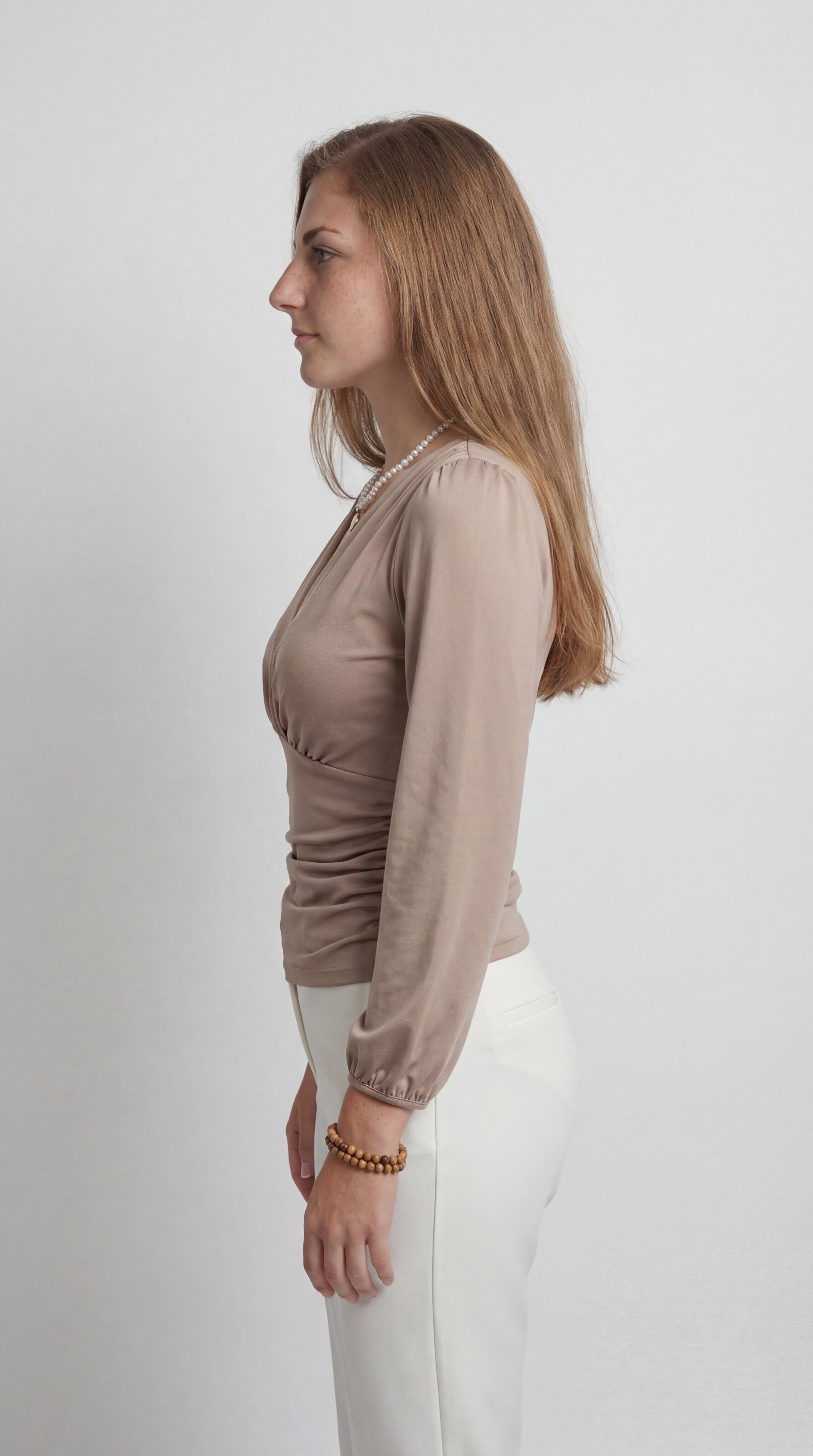 Overslaghals die het decolleté subtiel accentueert voor een vrouwelijke look