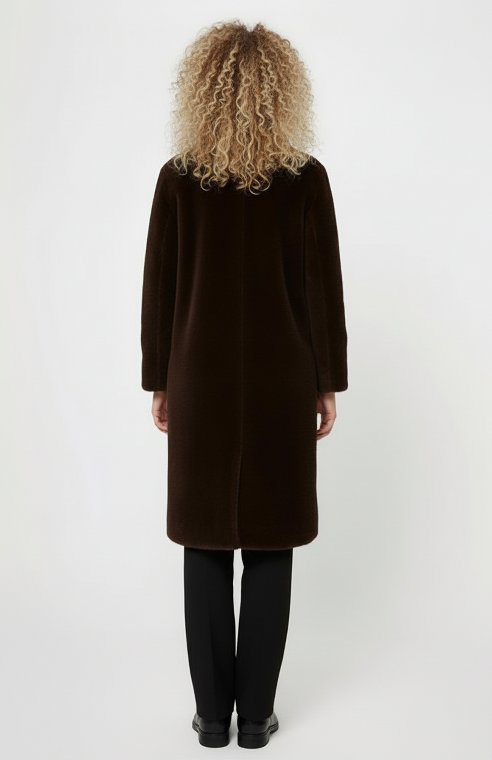 Deze lange winterjas biedt een comfortabele pasvorm met een verfijnde v-halslijn. Het zachte materiaal met een faux fur look zorgt voor een luxe uitstraling, perfect voor koude dagen.